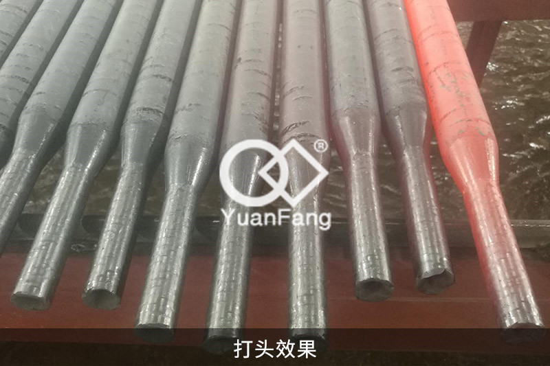 可在冷或熱的狀態(tài)下擠鍛加工鋼管,打頭機(jī)自帶一個(gè)夾送輥裝置,它使母管轉(zhuǎn)動(dòng)并將其喂入打頭機(jī),并在打頭完成后將鋼管送出打頭機(jī)。 材質(zhì):SA2100、T12、T22、T23、T91;